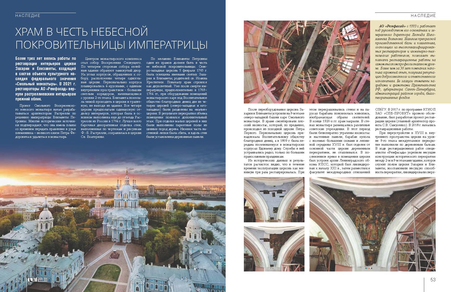 Более трех лет велись работы по реставрации интерьеров церкви Захарии и Елизаветы, входящей в состав объекта культурного наследия федерального значения «Смольный монастырь». В 2021 г. реставраторы АО «Ремфасад» вернули растреллиевским интерьерам прежний облик.