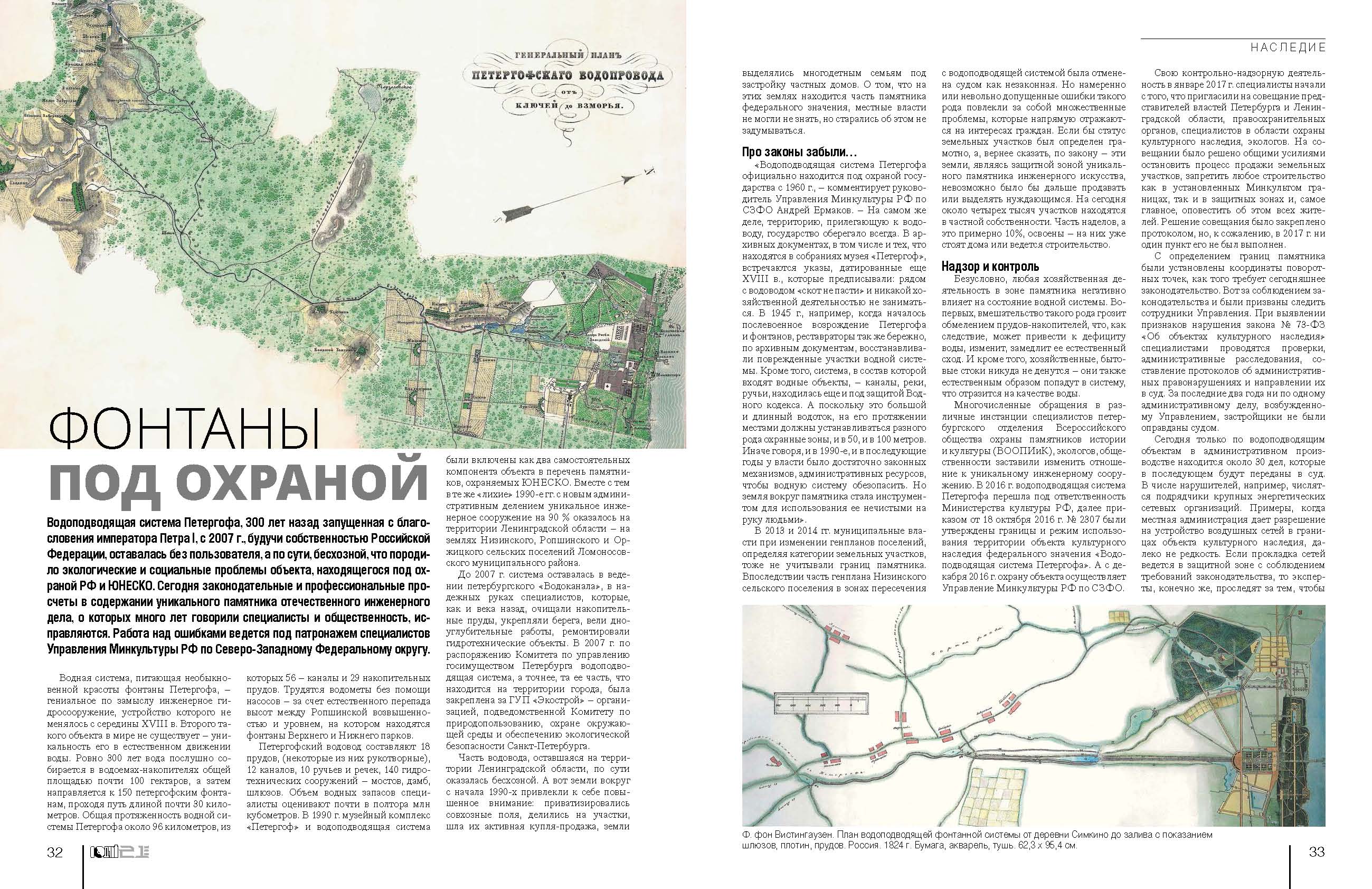 Водоподводящая система Петергофа, 300 лет назад запущенная с благословения императора Петра I, с 2007 г., будучи собственностью Российской Федерации, оставалась без пользователя, а по сути, бесхозной, что породило экологические и социальные проблемы объекта, находящегося под охраной РФ и ЮНЕСКО. Сегодня законодательные и профессиональные просчеты в содержании уникального памятника отечественного инженерного дела, о которых много лет говорили специалисты и общественность, исправляются. Работа над ошибками ведется под патронажем специалистов Управления Минкультуры РФ по СевероЗападному Федеральному округу.