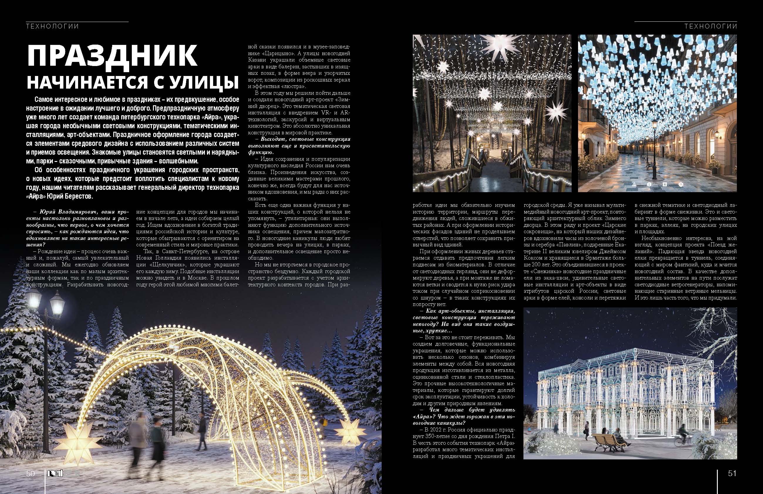 Самое интересное и любимое в праздниках – их предвкушение, особое настроение в ожидании лучшего и доброго. Предпраздничную атмосферу уже много лет создает команда петербургского технопарка «Айра», украшая города необычными световыми конструкциями, тематическими инсталляциями, арт-объектами. Праздничное оформление города создается элементами средового дизайна с использованием различных систем и приемов освещения. Знакомые улицы становятся светлыми и нарядными, парки – сказочными, привычные здания – волшебными.