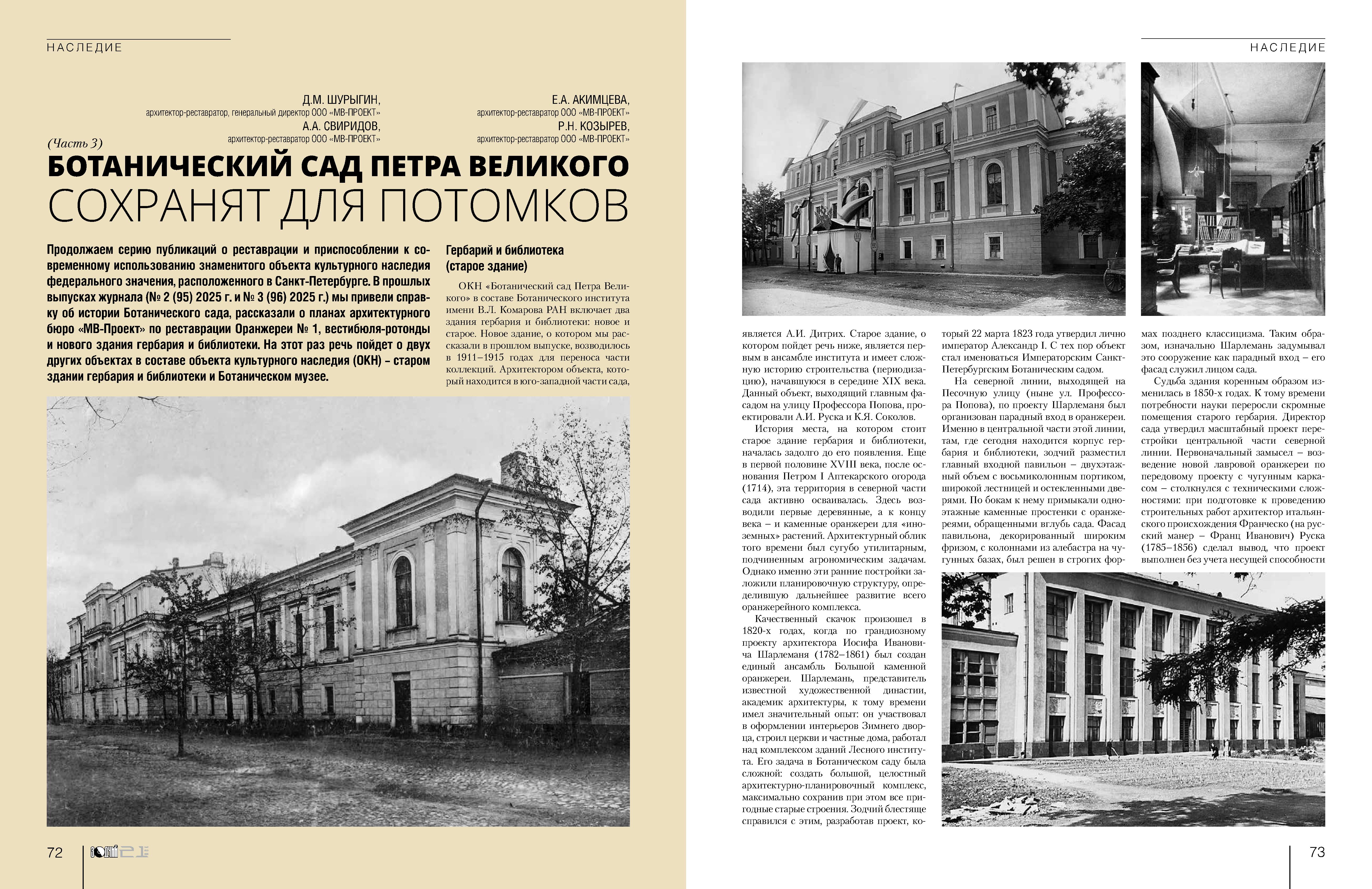 Продолжаем серию публикаций о реставрации и приспособлении к современному использованию знаменитого объекта культурного наследия федерального значения, расположенного в Санкт-Петербурге. В прошлых выпусках журнала (№ 2 (95) 2025 г. и № 3 (96) 2025 г.) мы привели справку об истории Ботанического сада, рассказали о планах архитектурного бюро «МВ-Проект» по реставрации Оранжереи № 1, вестибюля-ротонды и нового здания гербария и библиотеки. На этот раз речь пойдет о двух других объектах в составе объекта культурного наследия (ОКН) – старом здании гербария и библиотеки и Ботаническом музее.