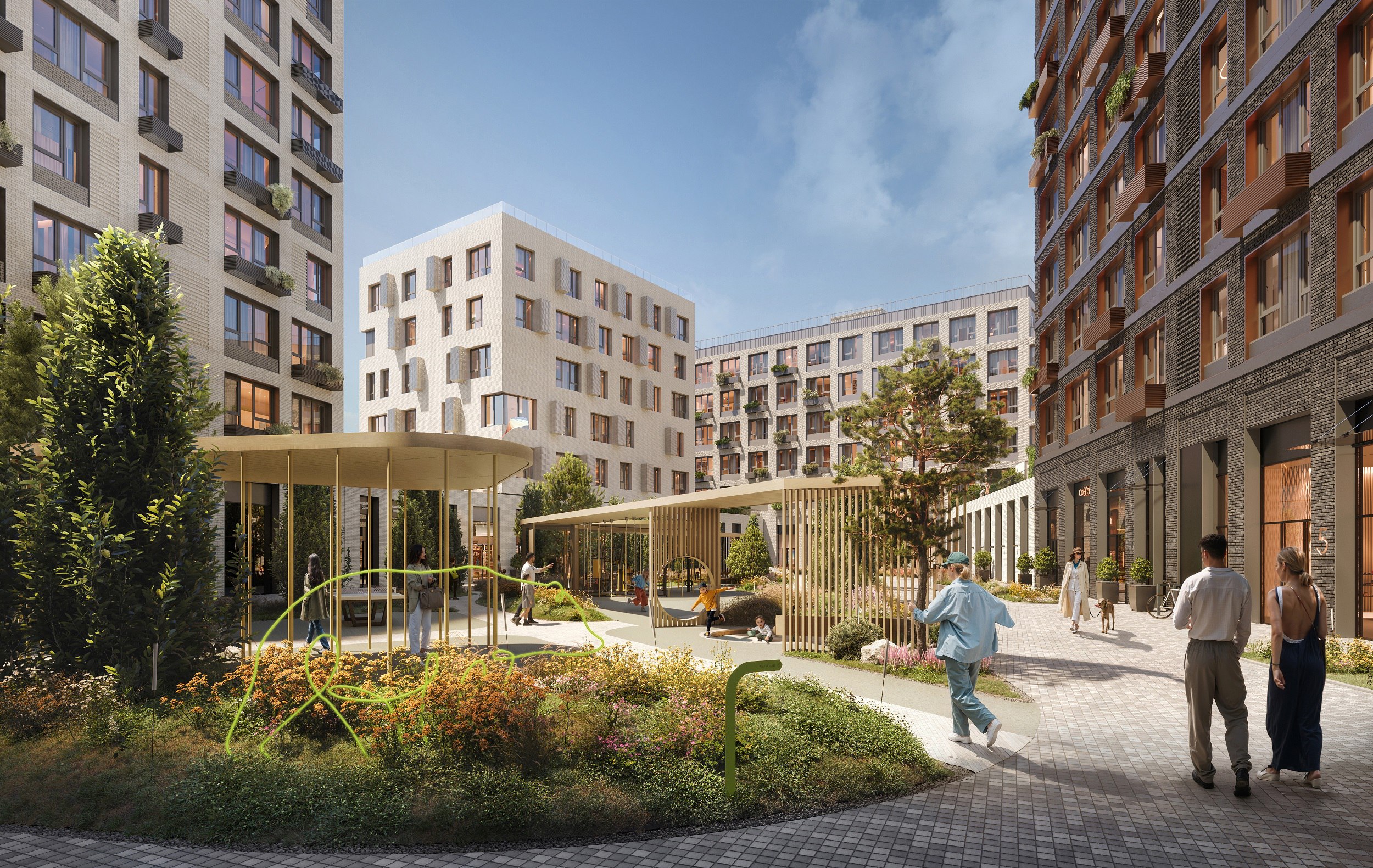 Среди многоэтажных жилых комплексов победителем стал ЖК из четырех высотных башен до 190 м в Красногорске с ярким архитектурным обликом («Мезонпроект»). Эксплуатируемая кровля стилобата с искусственным рельефом решает задачу шумозащиты и создает дополнительный рекреационный уровень.