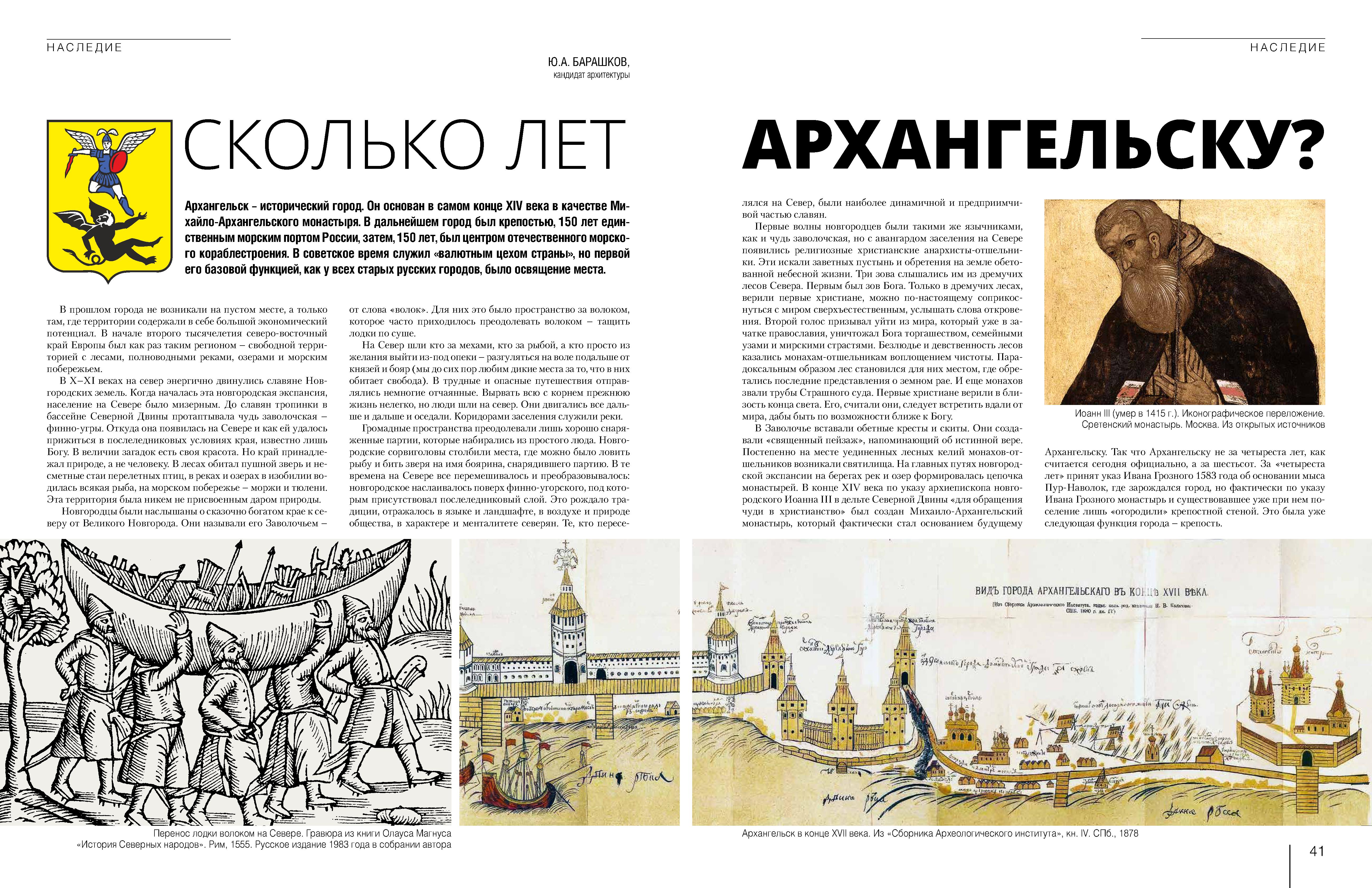 Архангельск – исторический город. Он основан в самом конце XIV века в качестве Михайло-Архангельского монастыря. В дальнейшем город был крепостью, 150 лет единственным морским портом России, затем, 150 лет, был центром отечественного морского кораблестроения. В советское время служил «валютным цехом страны», но первой его базовой функцией, как у всех старых русских городов, было освящение места.