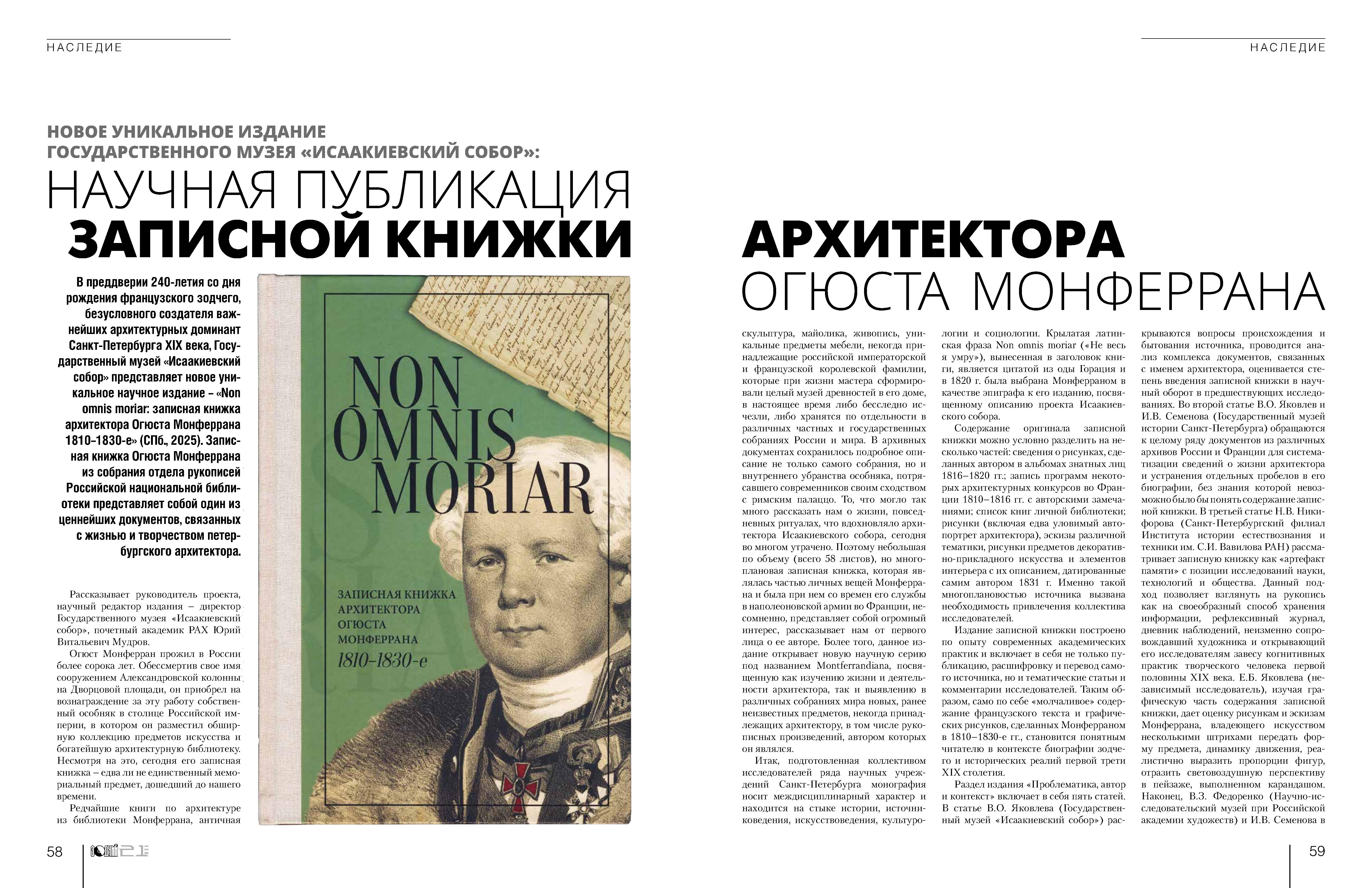 В преддверии 240-летия со дня рождения французского зодчего, безусловного создателя важнейших архитектурных доминант Санкт-Петербурга XIX века, Государственный музей «Исаакиевский собор» представляет новое уникальное научное издание – «Non omnis moriar: записная книжка архитектора Огюста Монферрана 1810–1830-е» (СПб., 2025). Записная книжка Огюста Монферрана из собрания отдела рукописей Российской национальной библиотеки представляет собой один из ценнейших документов, связанных с жизнью и творчеством петербургского архитектора.