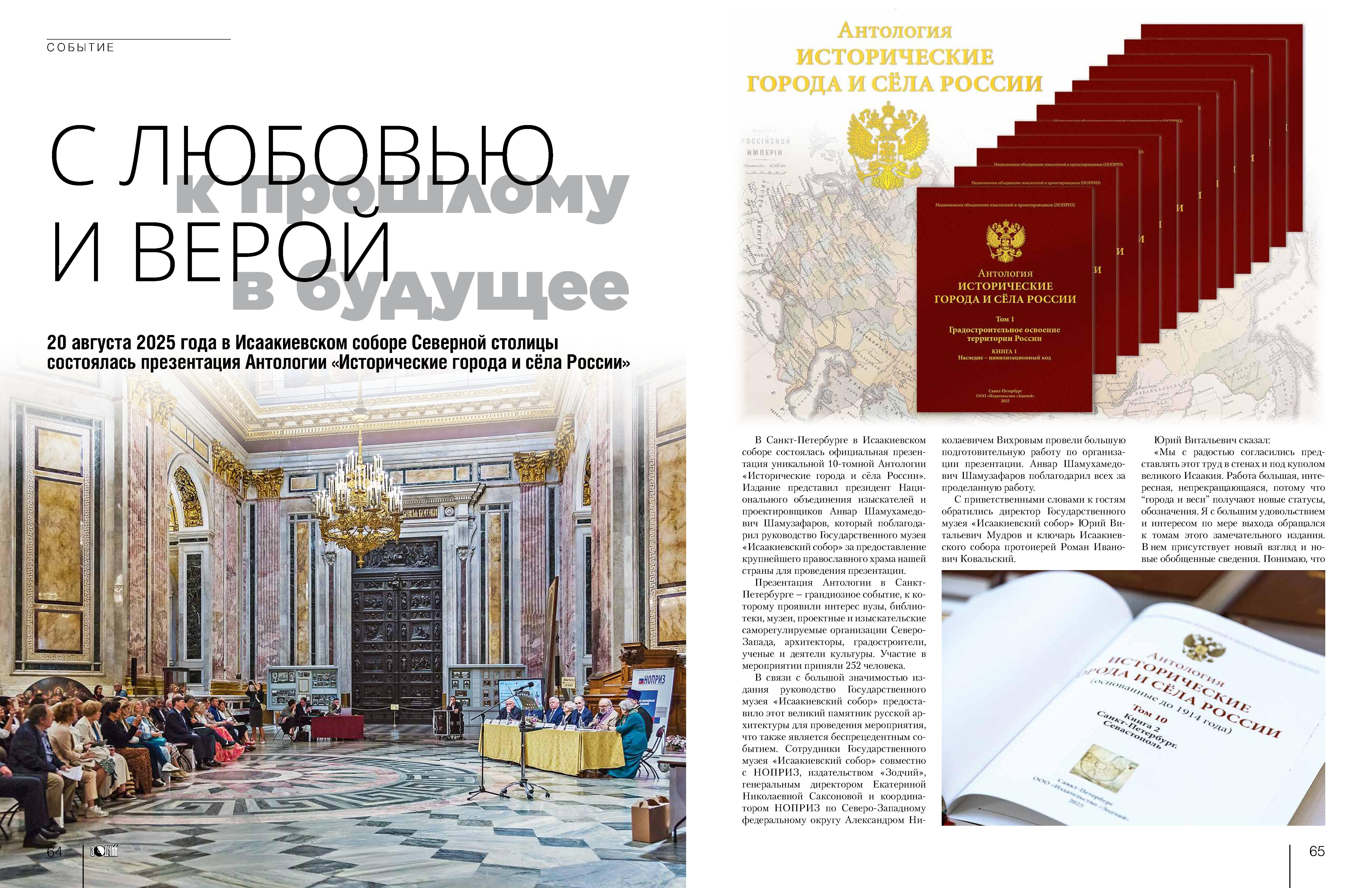 В Санкт-Петербурге в Исаакиевском соборе состоялась официальная презентация уникальной 10-томной Антологии «Исторические города и сёла России». Издание представил президент Национального объединения изыскателей и проектировщиков Анвар Шамухамедович Шамузафаров, который поблагодарил руководство Государственного музея «Исаакиевский собор» за предоставление крупнейшего православного храма нашей страны для проведения презентации.