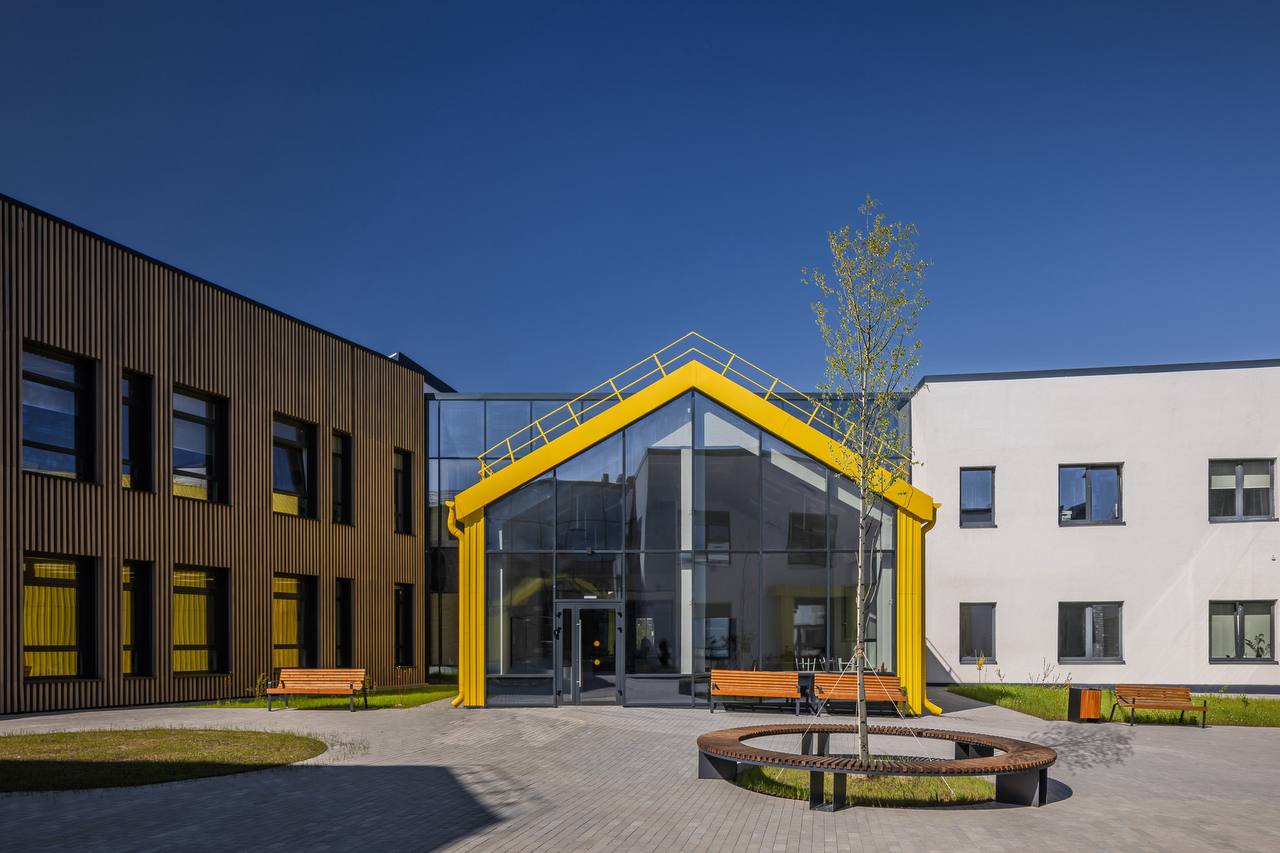 Проект-победитель в номинации социальной инфраструктуры — образовательная школа на 500 мест в г.о. Подольск («ЛАБВА ПРО»). Необычная композиция построена на контрасте двух крыльев, объединенных двусветным пространством центральной рекреации-атриума. Архитектура выстроена на диалоге материалов: фасад одного крыла — вентилируемый, с алюминиевыми кассетами под брашированную медь; другого — с бетонной плиткой под белый кирпич.