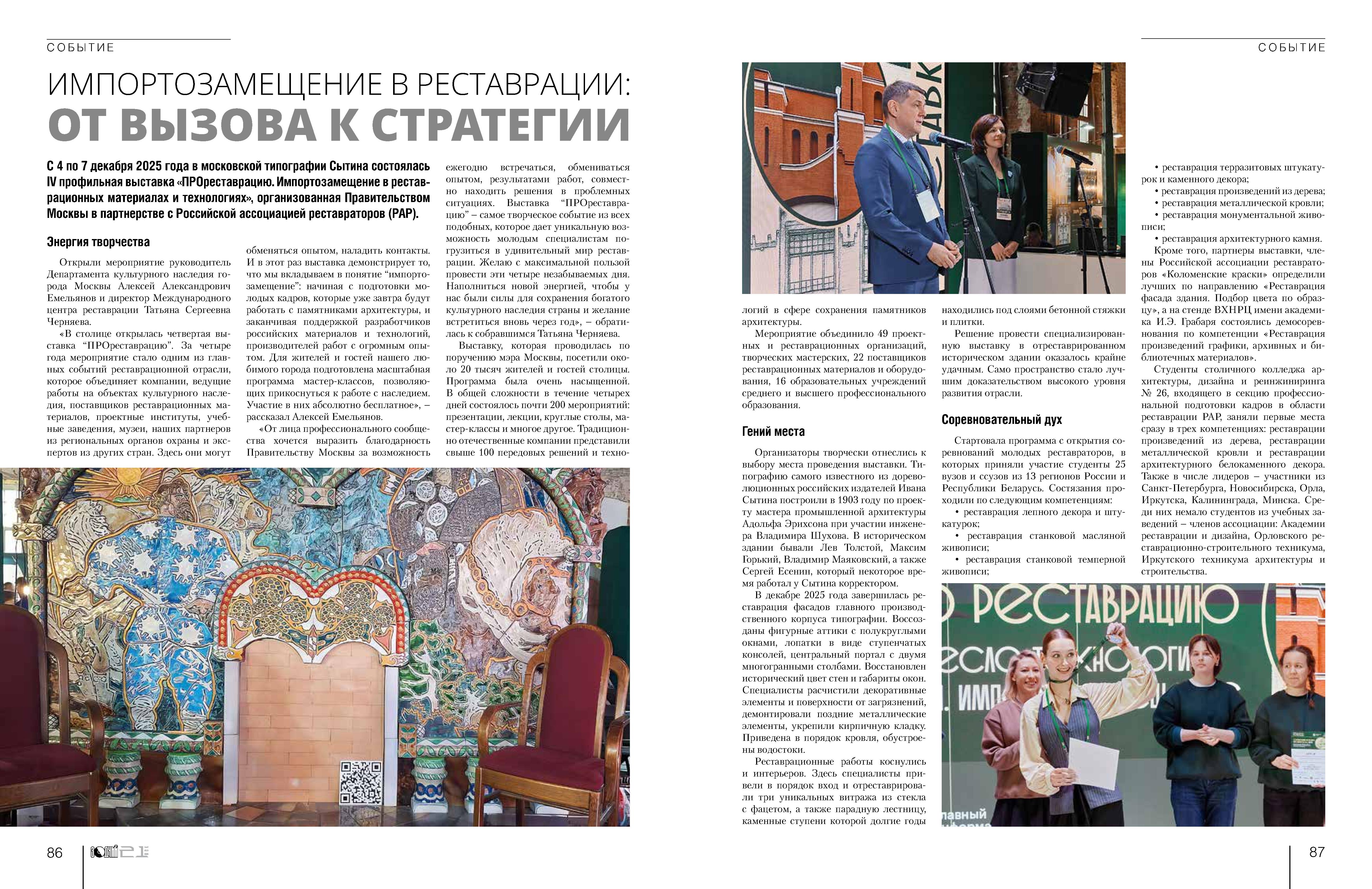 С 4 по 7 декабря 2025 года в московской типографии Сытина состоялась IV профильная выставка «ПРОреставрацию. Импортозамещение в реставрационных материалах и технологиях», организованная Правительством Москвы в партнерстве с Российской ассоциацией реставраторов (РАР).